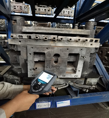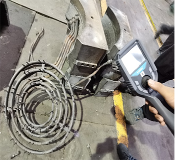 客戶現(xiàn)場主要看輪轂?zāi)ゾ邇?nèi)部通道的堵塞、脫落、毛刺情況,管通道孔徑13mm, 呈環(huán)狀分布,進(jìn)口5cm的位置,有雙向的分支通管,亞泰光電MIE高清系列內(nèi)窺鏡的探頭進(jìn)入導(dǎo)管后,需要分別從兩端進(jìn)入,本次演示時,沒有2.8mm360°轉(zhuǎn)向的演示設(shè)備,需要手動旋轉(zhuǎn)管線,預(yù)判轉(zhuǎn)向方位,清晰度方面客戶對MIE內(nèi)窺鏡非常認(rèn)可。導(dǎo)管內(nèi)部多處焊接的位置,實測時能明顯看見內(nèi)部的焊接堵塞,還有部分脫落,放置貨架的模具,內(nèi)部有大量灰塵、蟲子等多余物。客戶方現(xiàn)場相關(guān)負(fù)責(zé)人表示他們前面找了很久類似的內(nèi)窺鏡產(chǎn)品,對亞泰光電2.2mm內(nèi)窺鏡產(chǎn)品效果很認(rèn)可,當(dāng)即表示了進(jìn)一步合作的意向。