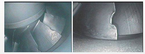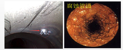 左邊圖片是對管子的檢測圖像采集,上圖很明顯的可以看到管子內(nèi)部存在著起皮。右邊圖可以看到管子內(nèi)部已經(jīng)被腐蝕。