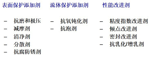 添加劑:清凈分?jǐn)?shù)劑、抗氧抗腐劑、油性劑和極壓抗磨劑