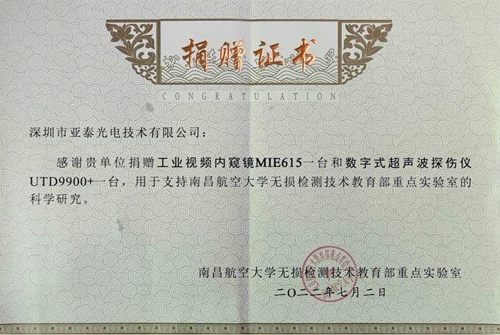 7月1日,深圳市亞泰光電技術(shù)有限公司(以下簡(jiǎn)稱(chēng)“亞泰光電”)向南昌航空大學(xué)無(wú)損檢測(cè)技術(shù)教育部重點(diǎn)實(shí)驗(yàn)室(以下簡(jiǎn)稱(chēng)“實(shí)驗(yàn)室”)捐贈(zèng)兩臺(tái)無(wú)損檢測(cè)設(shè)備,用于支持實(shí)驗(yàn)室無(wú)損檢測(cè)科學(xué)研究。亞泰光電公司鄭翔總經(jīng)理和實(shí)驗(yàn)室李志農(nóng)教授通過(guò)云端方式出席捐贈(zèng)儀式。