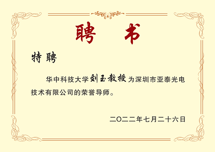 鄭總表示:國將興,必貴師而重傅。師者,傳道授業(yè)解惑。今天,非常榮幸的邀請(qǐng)到華中科技大學(xué)劉玉教授擔(dān)任亞泰光電榮譽(yù)導(dǎo)師,期望亞泰光電在劉玉導(dǎo)師的指導(dǎo)下能更上一個(gè)新臺(tái)階。劉教授帶領(lǐng)的Dian團(tuán)隊(duì)孵化出了60多家公司,誕生了2家獨(dú)角獸,其中,有25家企業(yè)估值過億,兩名弟子榮登福布斯“中國30位30歲以下創(chuàng)業(yè)者”榜單。劉教授用實(shí)際行動(dòng)詮釋了敬業(yè)、無私的高尚精神,為莘莘學(xué)子們謀劃了未來,點(diǎn)亮了人生!