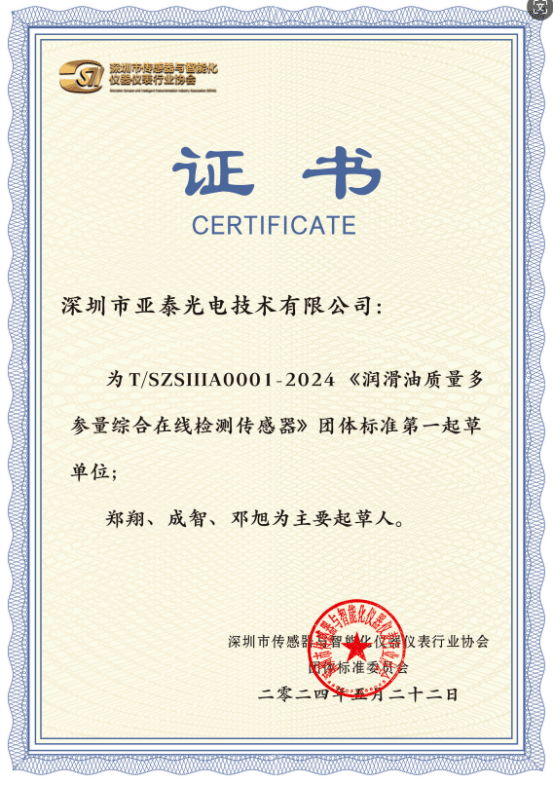 在《深圳市培育發(fā)展智能傳感器產(chǎn)業(yè)集群行動計劃(2022-2025年)》的指導(dǎo)下,傳感器企業(yè)越來越成為深圳國民經(jīng)濟和社會發(fā)展的新質(zhì)生產(chǎn)力,但與此同時,在潤滑油在線檢測傳感器領(lǐng)域并沒有具有針對性的指導(dǎo)標準。亞泰光電牽頭起草全國首個油液監(jiān)測傳感器器團體標準(T/SZSIIIA0001-2024),已實施并出版(由中國標準出版社出版發(fā)行,各地新華書店經(jīng)銷)。這是對深圳市亞泰光電技術(shù)有限公司和相關(guān)潤滑油狀態(tài)監(jiān)測傳感器企業(yè)提出了更高的要求。它將推動傳感器技術(shù)的創(chuàng)新、促進潤滑油行業(yè)的數(shù)字化轉(zhuǎn)型、加強行業(yè)間的合作與交流,并提升我國在全球潤滑油市場的地位。隨著標準的深入實施和應(yīng)用,相信我國潤滑油行業(yè)將迎來更加廣闊的發(fā)展前景。