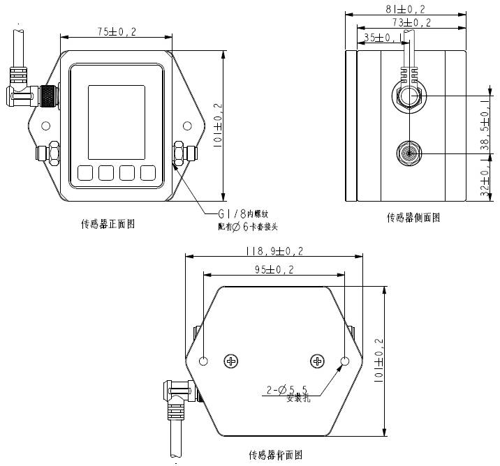 傳感器機(jī)箱的外形以及安裝孔尺寸圖 單位:mm
