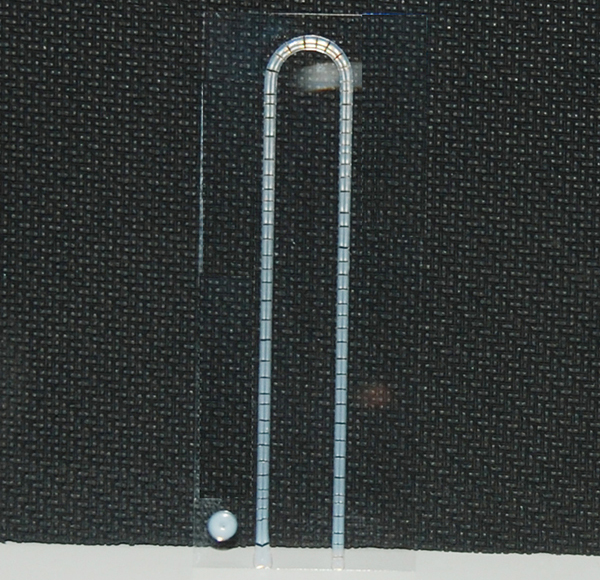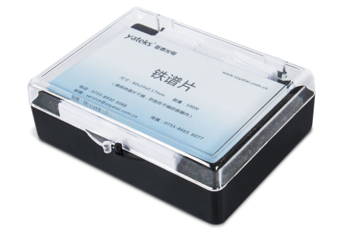 鐵譜片,分析式鐵譜儀耗材,用于油品定性分析——鐵譜分析制譜用。油樣經(jīng)虹吸泵引導(dǎo)流入鐵譜片,在高梯度磁場(chǎng)作用下,油品中的鐵磁性顆粒會(huì)按照規(guī)律排布于鐵譜片的U型槽內(nèi)。