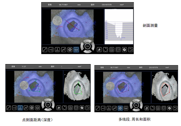 1、精準的三維測量功能——帶測量功能,可生成3D點云圖、深度圖、剖面圖等重現被測物體外貌輪廓,其中三維立體點云圖可縮放、旋轉等,實時驗證選點準確性,避免選點錯誤導致的測量結果失準。