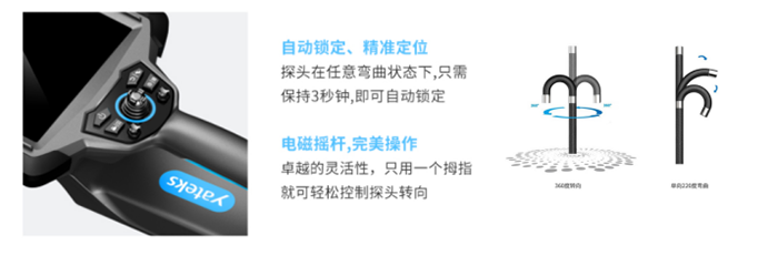 4、自動鎖定 精準定位——亞泰光電專利, 步進、快慢速調節和微調鎖定功能以及電動360°轉向控制,最大單向220°彎曲角度。